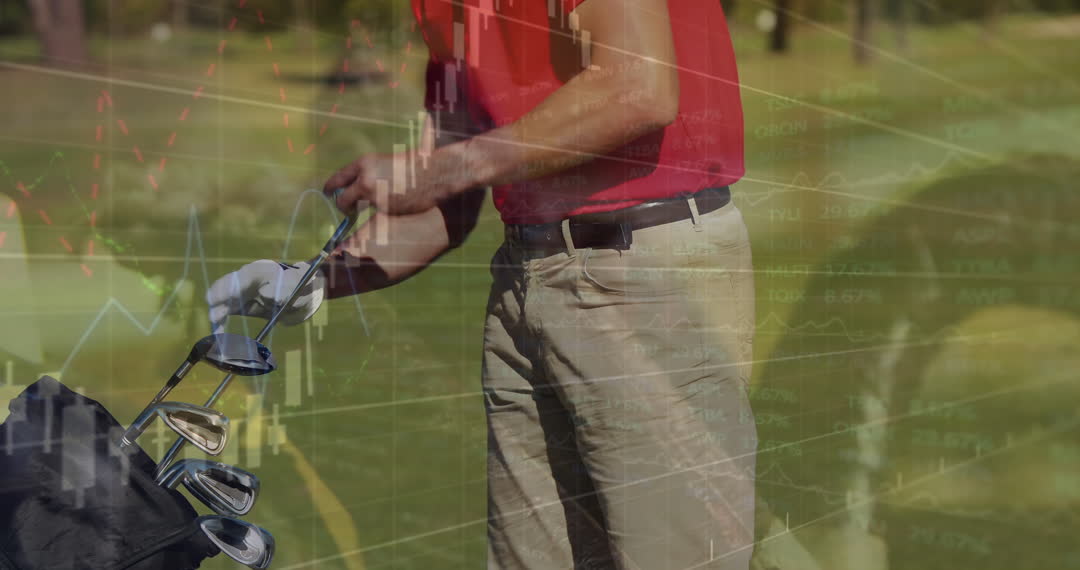 A golfer at a golf course interacting with golf clubs while digital data visualizations overlay the scene. This concept combines recreational golf activities with data analytics or financial metrics, potentially symbolizing efficiency or precision similar to metrics management. This video could be used in contexts focused on sports analytics, financial forecasting, or technology integration in leisure industries.
