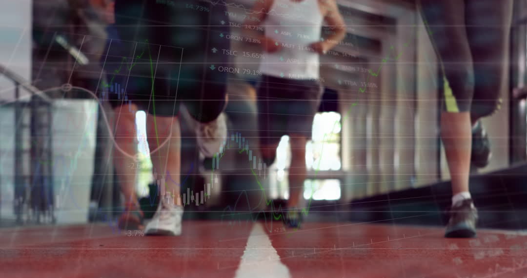 View of individuals running in a gym with a dynamic overlay of data analytics and stock prices, symbolizing the intersection of fitness and technology. Perfect for marketing in sports industry, tech communications, and editorial content related to health data analysis.