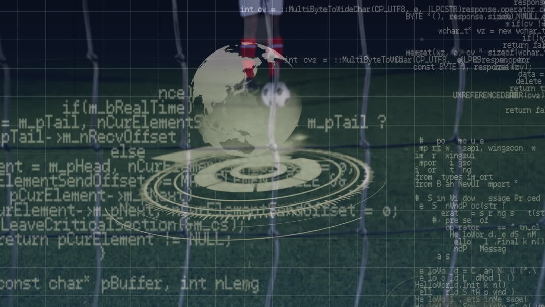 An animated scene shows data processing and coding overlaid on an African American male soccer player who appears to be in action. This visualization combines the dynamic energy of sports with high-tech digital surveillance reminiscent of data analytics, designed for use in technology and sports-themed projects. Ideal for illustrating concepts in sports analytics, digital transformations in sports, or futuristic sports events.