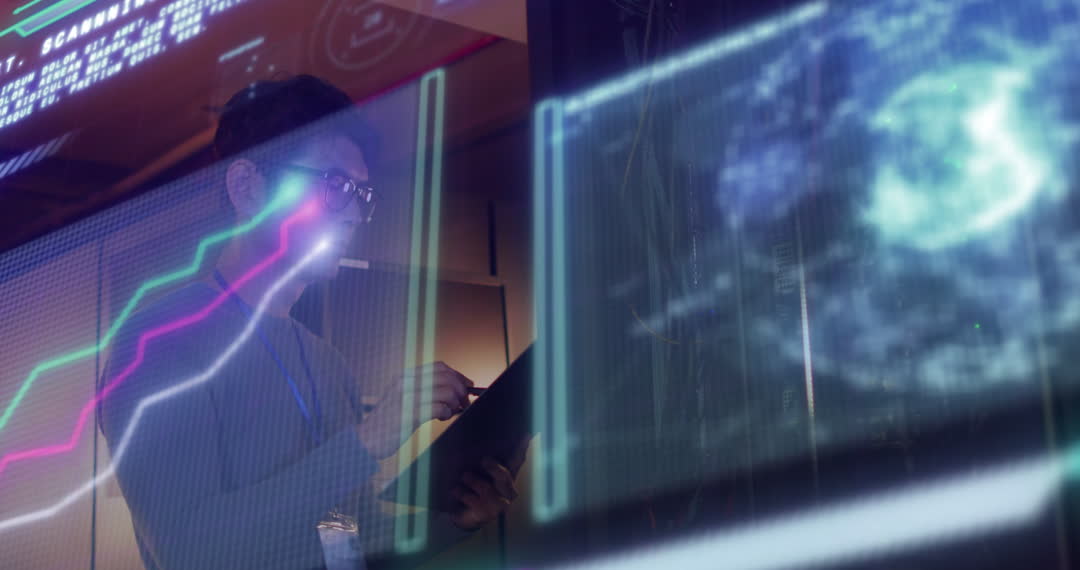 Depiction of a technology professional analyzing digital data in a server room with a futuristic display overlay. Used for highlighting concepts of cybersecurity, technology advancements, data analysis, information technology careers, and global business operations.