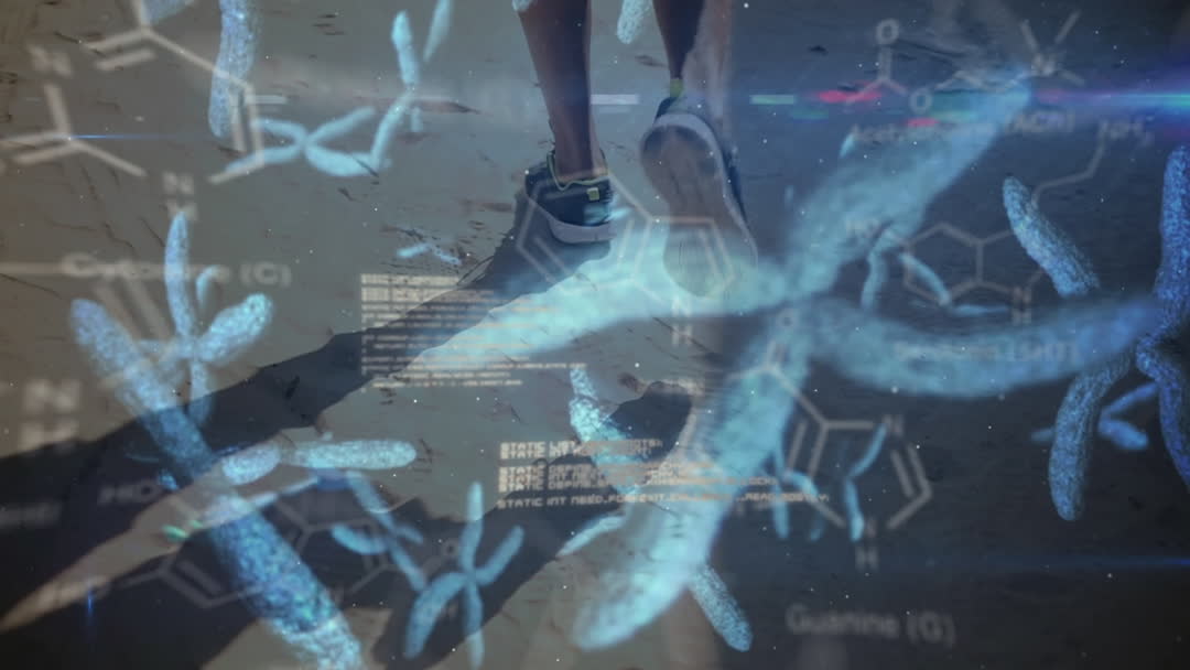 Visual combines biotechnology concepts with physical activity, ideal for illustrating the intersection between technology and sports wellness. Suitable for use in advertisements, articles, or presentations focused on digital health innovation, fitness technology advances, or bioinformatics applications.