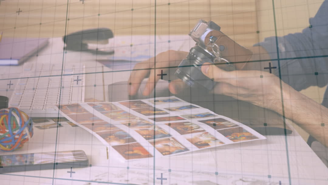 Digital overlay shows businessman using camera while visually processing data. Ideal for illustrating concepts of modern workplace integration, collaborative technology, and data-centric industries. Suitable for content about business innovation, digital enterprises, and photographic workflow.