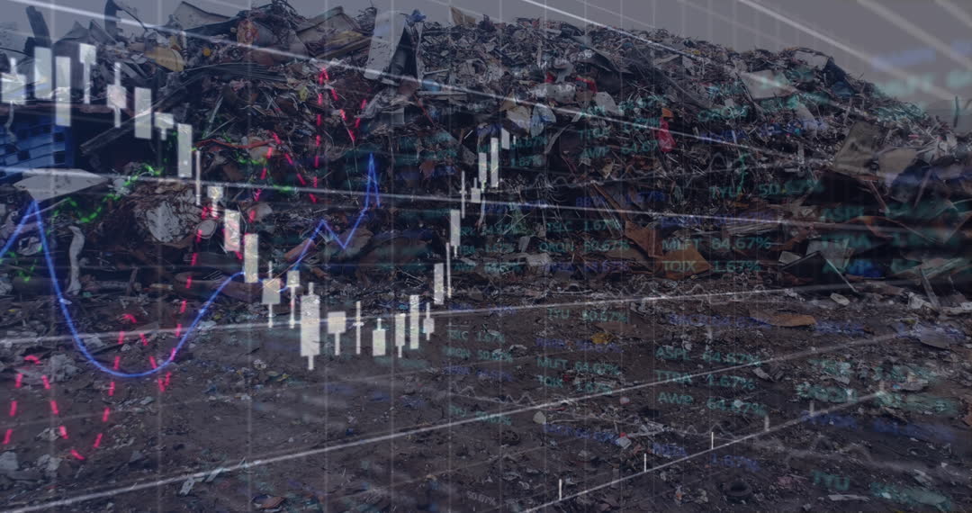 The video juxtaposes a digital data processing chart over a landfill, highlighting themes of global business and environmental sustainability. This integration suggests the analysis of ecological impact and the importance of sustainable waste management. Useful for topics around sustainability in business, waste management analytics, or digital environmental solutions.