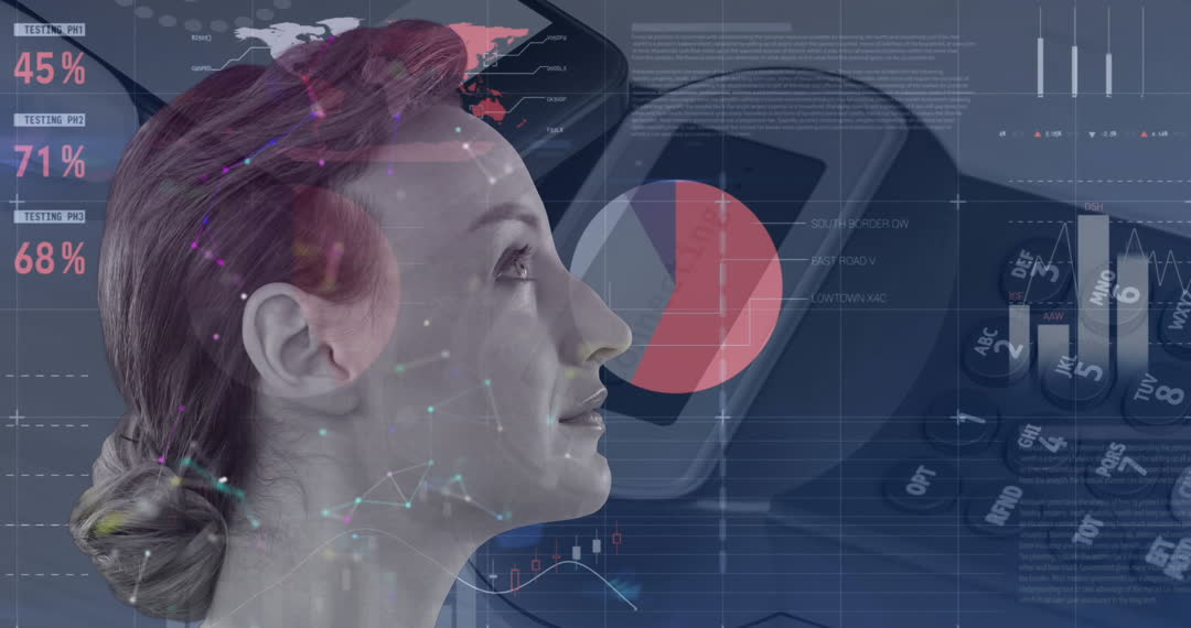 Abstract composition with profile of a woman amidst digital data visuals and a financial calculator interface. Ideal for illustrating themes of business intelligence, financial analysis, data-driven decision-making, and technology in finance sectors. Useful for articles, presentations, and educational content about the fusion of human intuition and computational tools in business analytics.