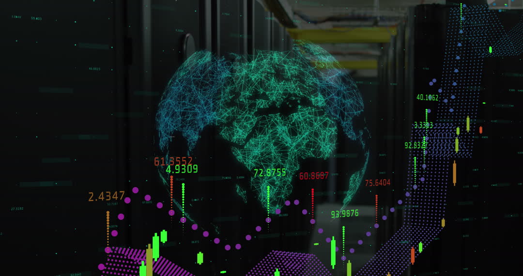 Overlapping data visualizations depicting global financial activity and computer servers convey themes of innovation and technological advancement in business and financial markets. Useful for presentations on modern computing technology, global commerce, or data analytics.