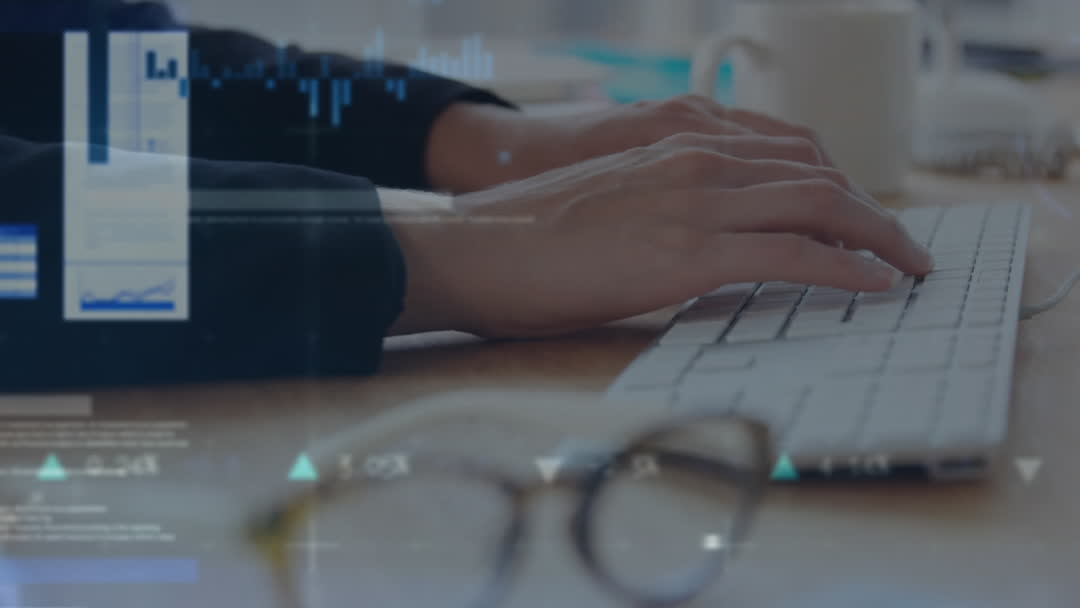 Hands of a businesswoman typing on a keyboard illustrate concepts of data analysis and corporate technology use. Scene includes digital graphs and metrics superimposed on video, suggesting integration of technology in office environment. Fit for use in presentations, blogs or articles involving modern workplace settings and analytics.
