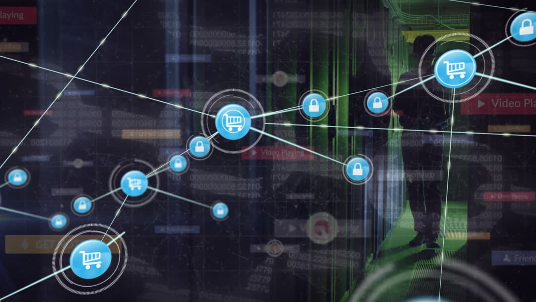 Depiction of a digital network interface overlaying a server room with blue icons symbolizing data processing and transactions. Bridging cyber industry concepts with physical infrastructure scenes, this video might be used in articles or presentations about cybersecurity, data management, digital markets, and technological innovations in business environments.