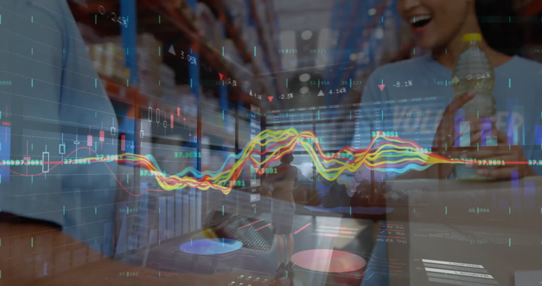 This video shows a digital overlay of complex financial or data charts atop a warehouse setting where diverse workers collaborate. The blend of human interaction and digital data signifies the intersection of technology and logistics. Suitable for use in articles or presentations relating to modern warehousing, logistics technology, data analytics, or finance in business. Ideal for illustrating concepts of teamwork and innovation in supply chain management.