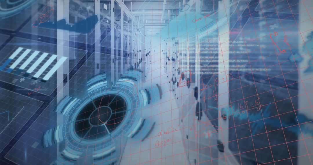 Captures data integration in a digital server environment with overlaid mathematical equations. Ideal for use in technology industry materials, AI and data science articles, business technology presentations, and innovation-themed projects to emphasize digital transformation and advanced computation capabilities.