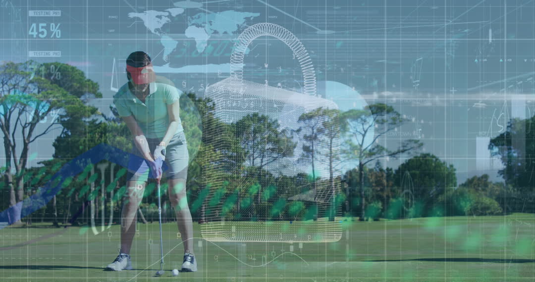 Graphic shows female golfer combined with digital elements, offering visual metaphor of technology integration in sports. Useful for articles on sports tech evolution, app designs, or cybersecurity in athletic environments.