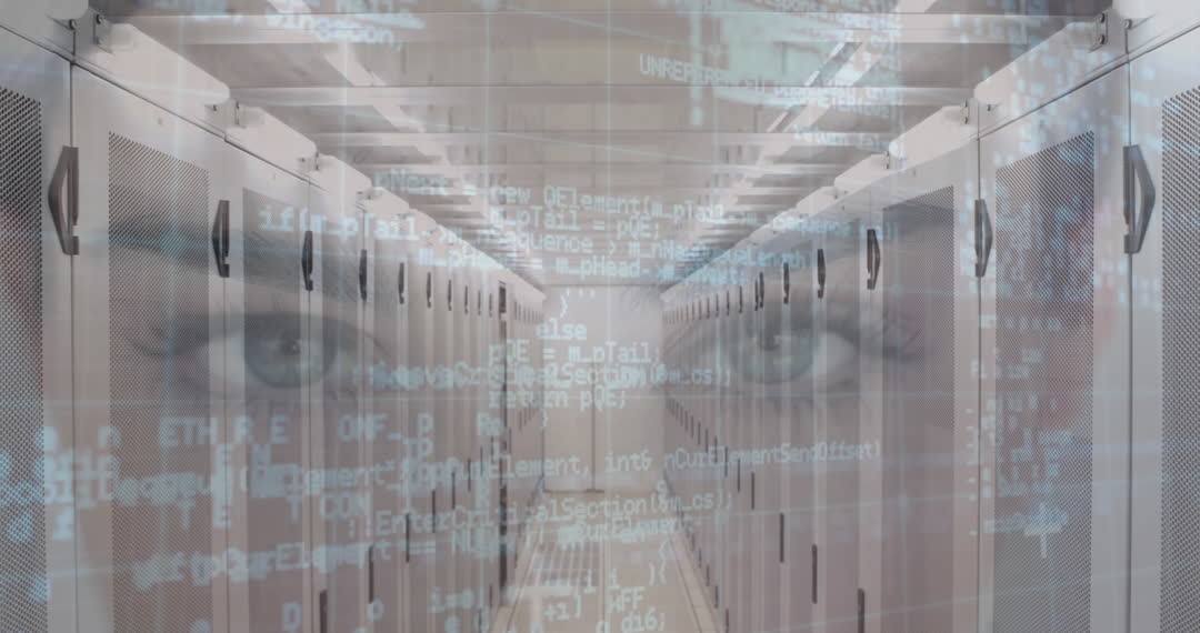 Animation showcases data processing overlay on computer servers with a human face symbolizing the intersection of human and technology. Ideal for use in promoting cybersecurity awareness, illustrating concepts of digital safety, and emphasizing importance of data protection in a globally connected network.