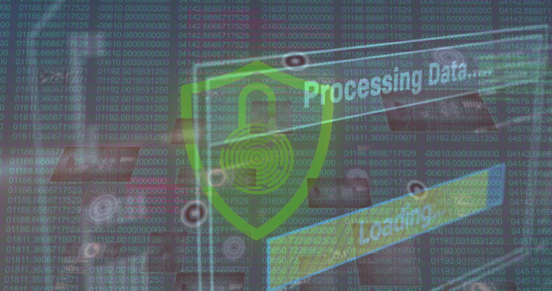 Illustrates cybersecurity and encryption with animation highlighting data processing and secure protection. Overlay of binary code with a shield emphasizes digital security for educational, promotional material related to IT industries, digital marketing, and online safety courses.