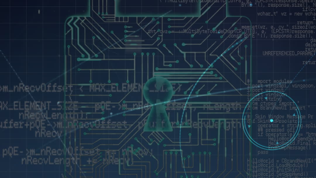 An animated depiction of data processing and security featuring a graphical padlock overlaying digital code, conveying a sense of cybersecurity and information protection. Ideal for use in tech company presentations, cybersecurity workshops, and articles related to digital privacy and secure global business operations.