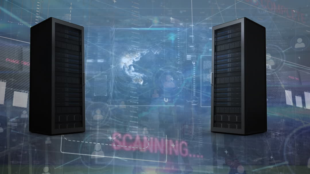 Visual depicts two robust data servers with animated scanning text and a digital overlay suggesting global connectivity. Perfect for illustrating concepts of data security, advanced technology, and digital information processing. Useful in technology presentations, cybersecurity seminars, and marketing materials for IT companies.