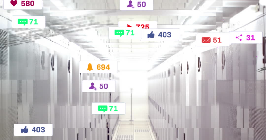 Data Servers with Overlay of Social Media Icons and Metrics Video