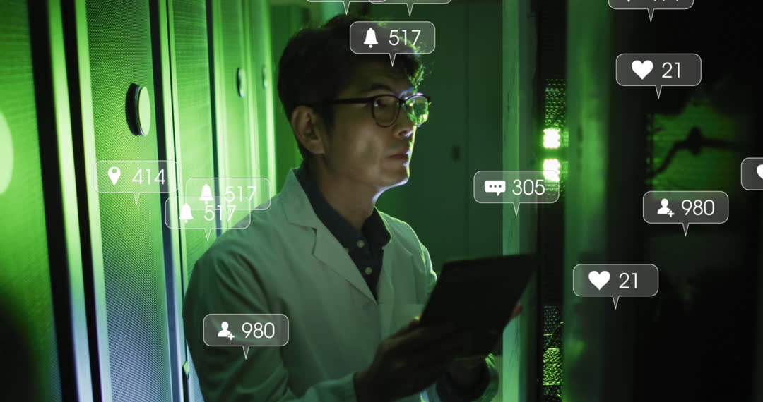 A dedicated server room worker surrounded by digital icons indicating live analytics data and social engagement metrics. Useful for illustrating concepts related to cloud computing, network management, digital marketing analytics, and ICT careers. Ideal for use in technology presentations, educational materials, or IT industry publications.