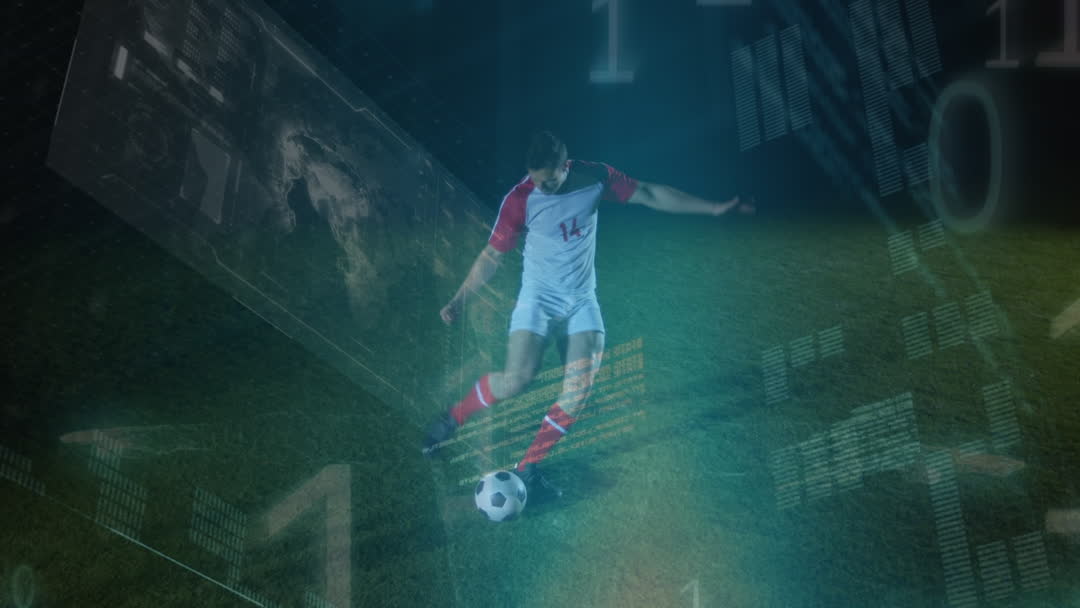 This visual concept illustrates the fusion of data processing and sports technology, featuring a soccer player surrounded by flowing binary code and data. Ideal for content related to advancements in sports analytics, futuristic sports concepts, or illustrating the importance of data in sports performance. It suits articles, presentations, and websites about digital transformation in sports.