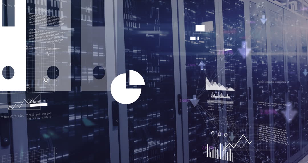This visual presents the concept of data processing and digital interfaces in a modern server room environment. The video illustrates data trends with graphs, pie charts, and code overlays. Ideal for use in presentations, tech blogs, company profiles in the IT sector, and educational materials on data analysis and storage solutions.