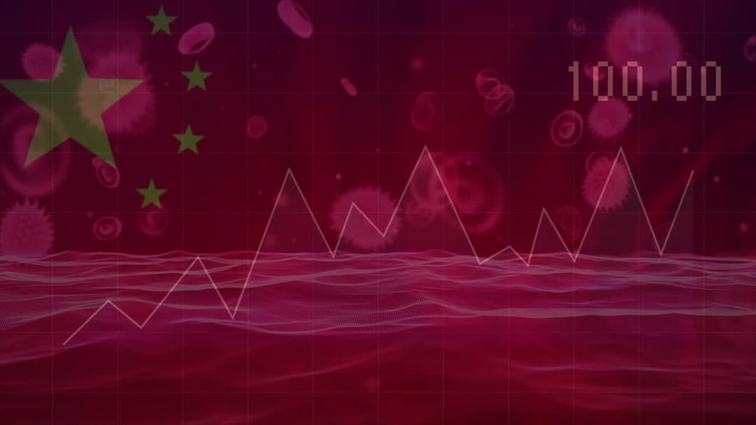 The visual shows an abstract digital animation featuring particles and green data coding flowing into a DNA helix formation, set against a dynamic red background. This suggests advancements in global technology and science. Vivid digital themes and code visualizations make it ideal for projects emphasizing innovation, research, technological advancements, or multinational business presentations. Additionally, it effectively illustrates abstract concepts such as data interaction and complex networks.