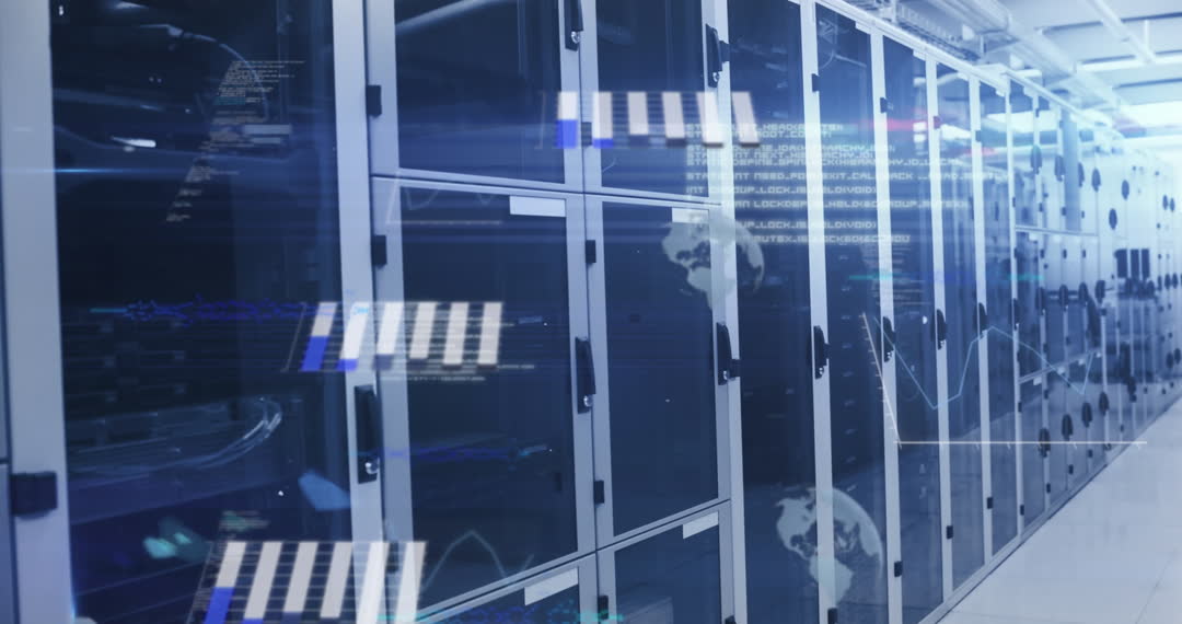 Visual depicting advanced data visualization layered over a modern server room environment. This high-tech videory of server infrastructure complements themes of data processing, computer science, and business technology, useful for illustrating articles and ads on data management, IT services, and digital innovations.