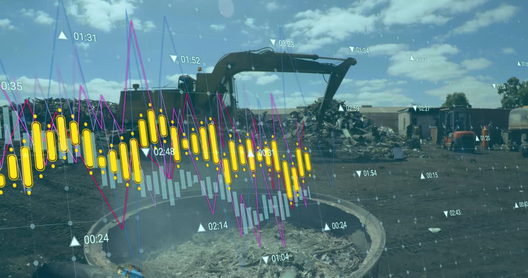Excavator operates in a landfill with illuminated graphs and charts overlaid, illustrating real-time data monitoring. Useful for content on waste management, environmental monitoring, or discussing global ecology challenges in corporate presentations or educational materials.