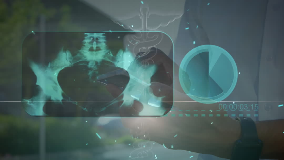Concept of modern business communication with digital overlay of charts and x-ray videory while a businessman is engaged in smartphone use. Useful for content on innovation, technology integration, or financial analysis.