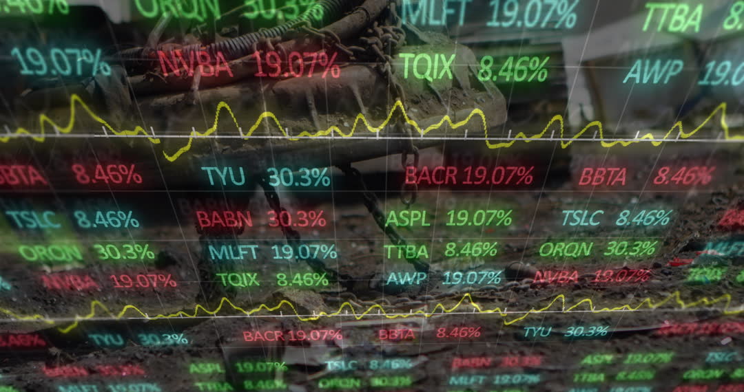 Graphic shows data overlays including stocks and market values in front of refuse, coupling finance with environmental issues. Useful for presentations on circular economy, technological integration in waste management or environmental finance reports. Illustrates interconnectedness of markets with ecological challenges.