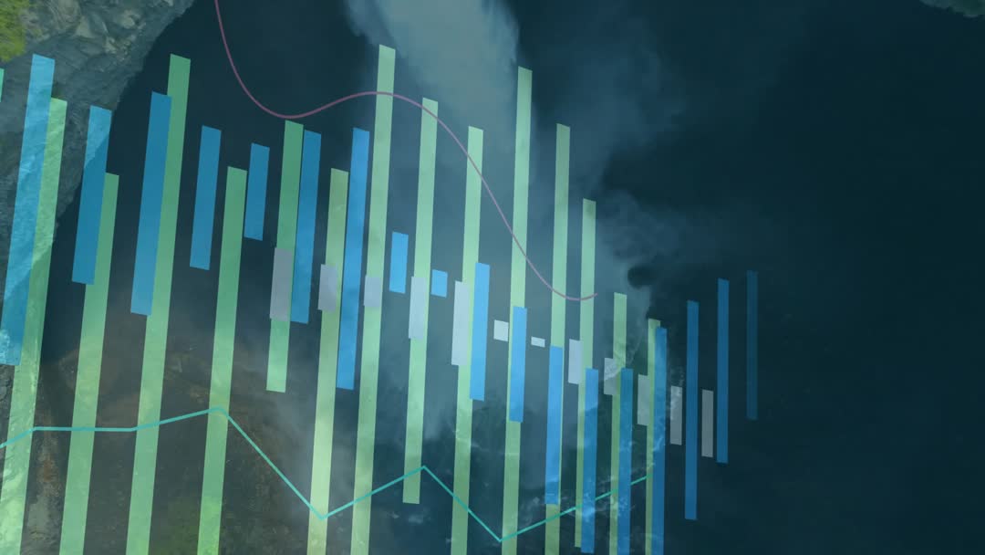 Video clip featuring bars growing and sliding over a scenic waterfall backdrop with colored lines displaying data trends, merging technology with nature. Ideal for projects on analytics, digital multimedia, environmental storytelling, or creative content to illustrate data fluidity and natural aesthetics.