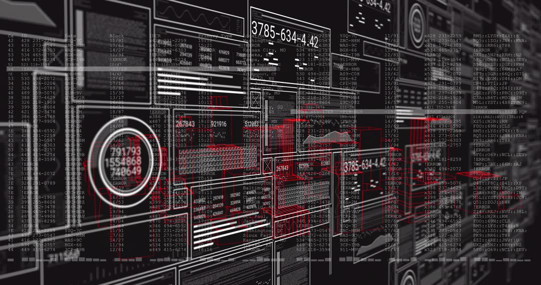 A complex digital interface showcasing dynamic data panels activated by a sweeping red bar. This video signifies modern technology and data analytics applications, useful for presentations on future technologies, data systems, or computer-generated imagery explorations.