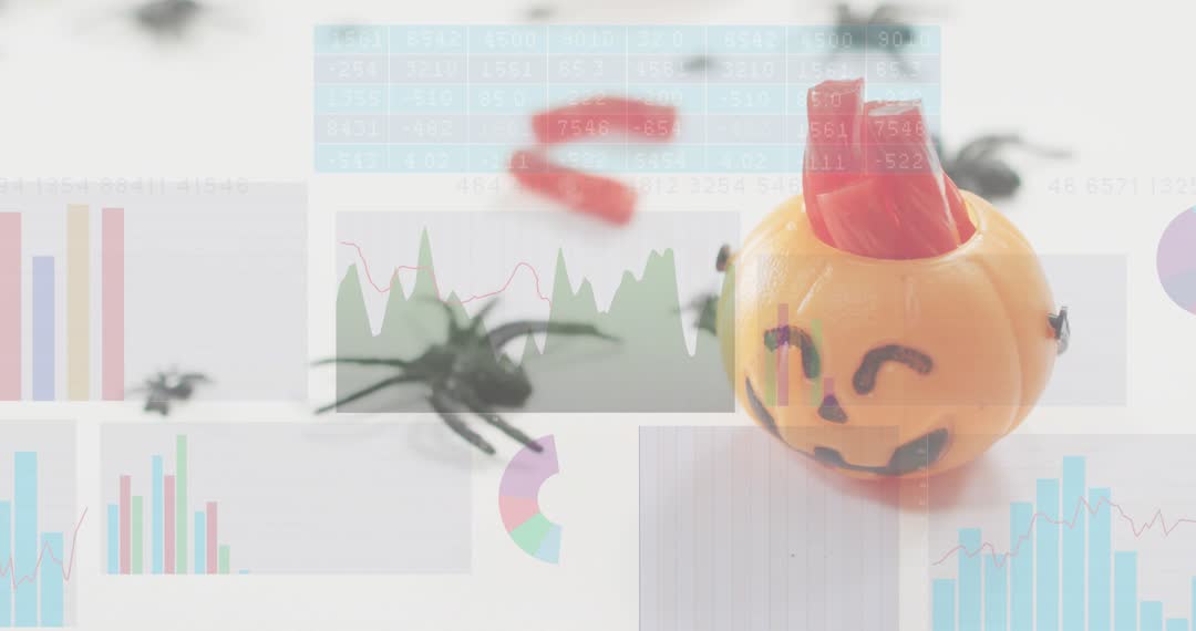 Animated video combining the thrill of Halloween with dynamic data charts. Spider movement toward the pumpkin candy holder suggests the intersection of traditional festivity and modern data analytics. Ideal for demonstrating the infusion of playful concepts into serious data discourse, making information engaging and memorable to a broader audience. Valuable for content centered on illustrating growth and innovation within contexts enjoyable for interactive activities or financial discussions.