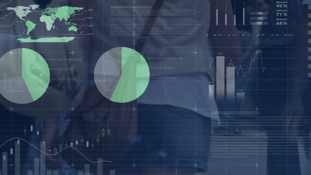 This video portrays data visualizations and graphs overlaying people walking in an office setting, symbolizing the importance of analytics in business environments. It is ideal for use in contexts related to business intelligence, finance consulting, econometrics, and presentations focusing on data-driven strategies. The presence of diverse individuals underscores themes of teamwork and collaboration in the corporate world.