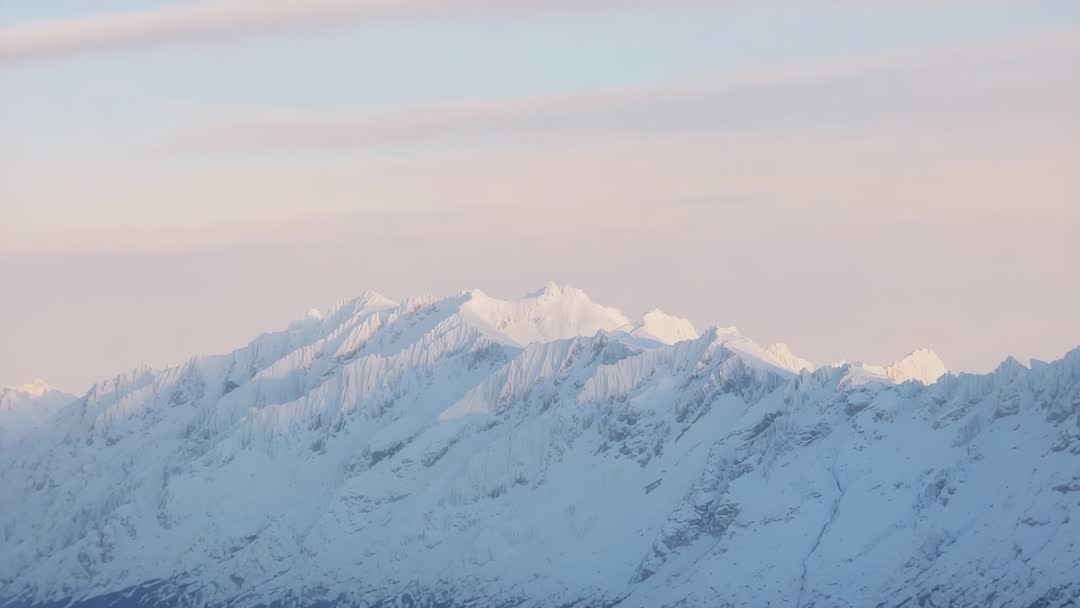 AI Generated Video. Shot showing snow-covered alpine ridge bathed in warm dawn alpenglow, jagged peaks cutting into soft pastel sky. Camera pulling back to reveal mid slopes and darker fore hill, creating layered depth and cinematic composition. Pale pink and blue tones producing tranquil, ethereal mood with strong contrast between sunlit crests and shadowed valleys. Wide horizontal format supporting text overlays and title bars. Use ideas: complementing travel video openers, enhancing documentary sequences about mountain environments, supporting adventure sports promos, illustrating climate or glacier change reports, powering tourism commercials and social media reels about sunrise hikes. Working well as background for inspirational narration, website hero banners, editorial features, and desktop wallpapers. Technical notes: wide aspect ratio, high detail on ridgelines, soft gradient sky allowing easy color grading and text placement.