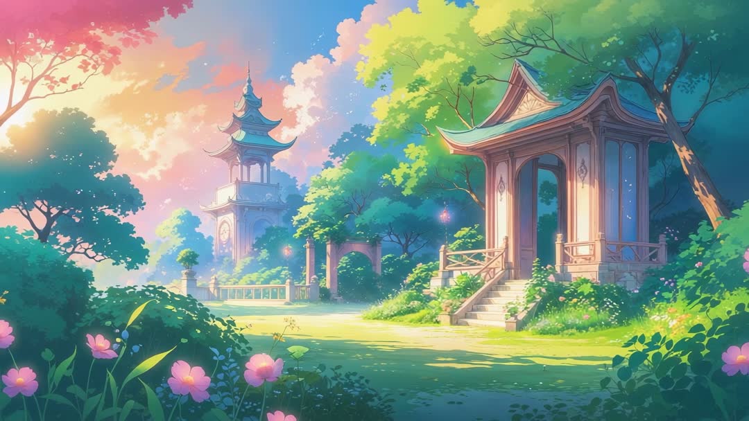 AI Generated Video. This beautiful animated scene captures sunlight gently spreading across a peaceful temple garden at dawn. The soft shadows of a traditional pavilion fall on the stone steps, and vibrant flower petals drift gently, creating a serene atmosphere. Ideal for spiritual, cultural content, or projects focusing on harmony between architecture and nature, this animated scene serves as a perfect background for videos or presentations seeking an aesthetic, peaceful ambiance.