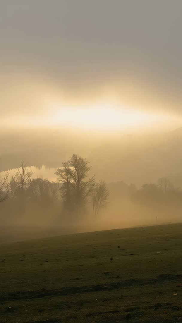 AI Generated Video. Vertical video capturing dawn light brightening low-lying mist over rolling meadow, showing silhouetted trees and mirror-like pond reflection. Soft golden backlight and haze creating atmospheric, peaceful mood and strong horizon line. Ideal for use as calming background for wellness apps, meditation videos, sleep or mindfulness content. Useful as opening shot for nature films, B-roll for documentaries, hero clip for travel or eco tourism campaigns, social media reels and vertical ads. Works well for seasonal marketing, real estate or retreat promotions, website header video, mobile screensavers, and weather or landscape storytelling. Recommend slow motion or gentle pan to enhance cinematic feel and highlight layered depth of mist and light.