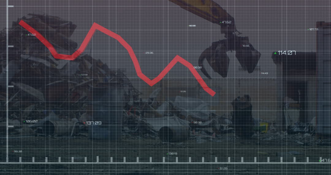 Illustrates an industrial junkyard with a declining financial graph overlay. Great for topics on economic downturns in the recycling industry, recession impacts, environmental and economic studies, and financial analysis in industrial sectors.
