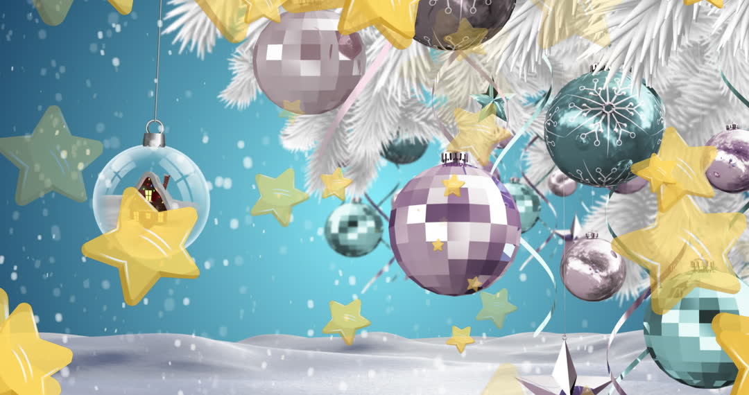 Festive animation depicting a white Christmas tree adorned with shiny pastel ornaments, surrounded by falling golden stars. Ideal for Christmas invitations, digital holiday greeting cards, or festive background designs in seasonal promotions.