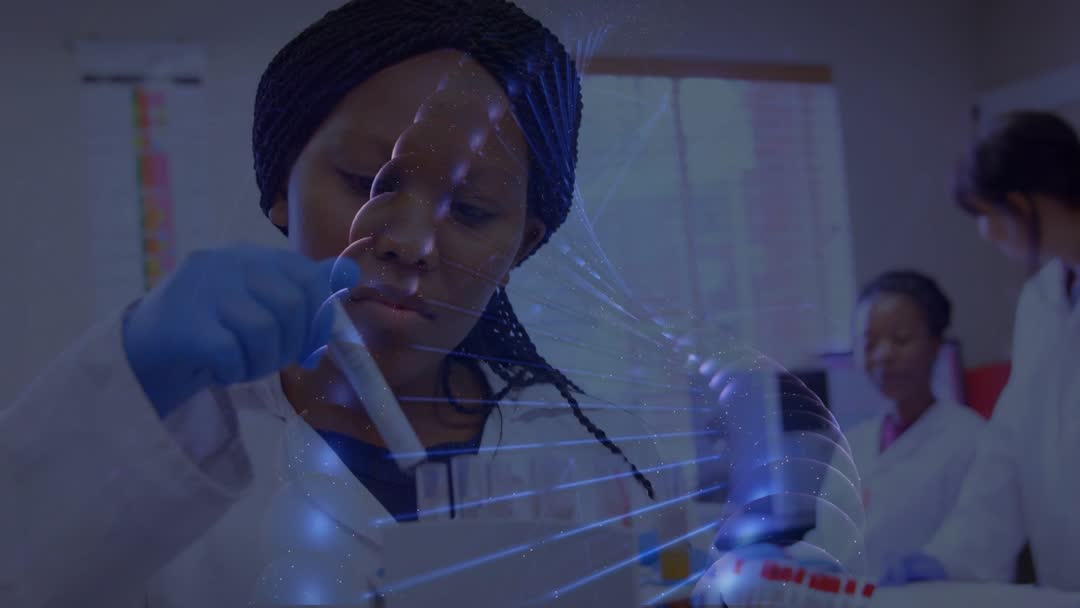 The video shows a female researcher reaching for pipette tip and dispensing a reagent while superimposed with imagery of a DNA helix, highlighting advanced genetic analysis techniques. Two other researchers can be seen working in the background, implying a collaborative environment in a high-tech lab. This footage is perfect for presentations or articles on scientific discoveries, genetic research innovations, teamwork in biotechnology settings, and showcasing advancements in the field of science. Use it for educational content, illustrating topics on genetics and the impact of science in modern biotechnology.