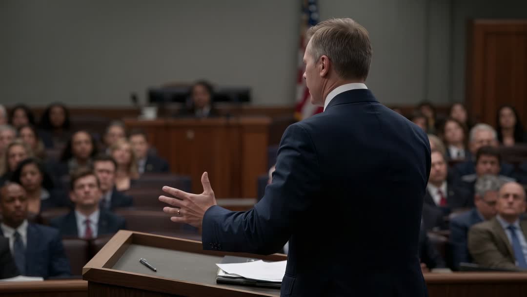 - Defense Attorney Addressing Jury While Gesturing at Lectern During Courtroom Trial