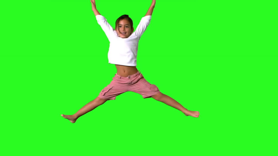 A young girl joyfully jumping with her arms and legs stretched out in front of a vibrant green screen. The bright background makes it versatile for digital effects and video editing. Perfect for advertising, educational content, or playful illustrations to convey themes of happiness, childhood joy, and energy.
