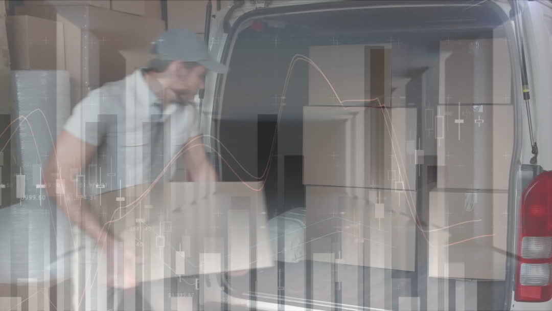 Image features male worker loading boxes into van with digital data overlay. Useful for illustrating technology integration in logistics and transportation, enhancing efficiency and productivity in delivery services. Boys conveys efficiency in modern supply Chain management using data analytics. Suitable for business presentations, articles on e-commerce advancements, and promotional materials for logistics companies emphasizing tech-driven solutions.