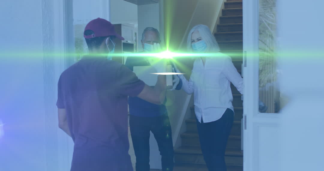 In this creative scene, a delivery man in a baseball cap holds out a package to a casually dressed senior couple at the entrance of their home. Both parties are wearing face masks reflecting a pandemic setting, emphasizing safety in personal interactions. The striking green laser effect overlays the scene, adding a futuristic and dynamic touch. This visual can be used to illustrate concepts related to modern logistics, safe delivery methodologies, senior care, or the integration of technology in everyday life.