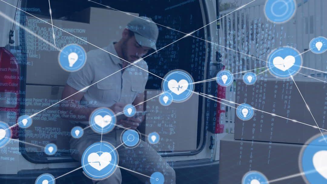 Image depicts a delivery man sitting in a van surrounded by a digital mesh of interconnected icons. Symbolizes the integration of technology into the logistics industry, showcasing how information flows globally. Useful for illustrating topics in business technology, courier services, and digital transformation in logistics.