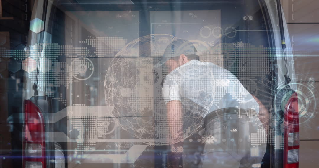Caucasian delivery man unloading boxes from a van with digital data and networks overlay on transparent screen, represents modern logistics and supply chain efficiency. Useful for business and technology themes, emphasizing innovation and global reach in logistics services.