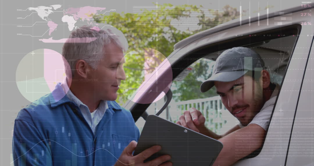 Image blending modern delivery practices with data technology. Features two men discussing logistics using technological interfaces. Perfect for illustrating smart logistics, modern business environments, or collaborative platforms in delivery services.
