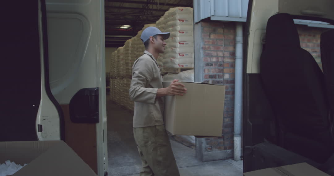 A young delivery worker is unloading packages from a van and carrying them into a warehouse. This scene highlights logistics and transportation services, and it could be used to represent efficient warehouse operations or delivery services in promotional materials, websites, or brochures.