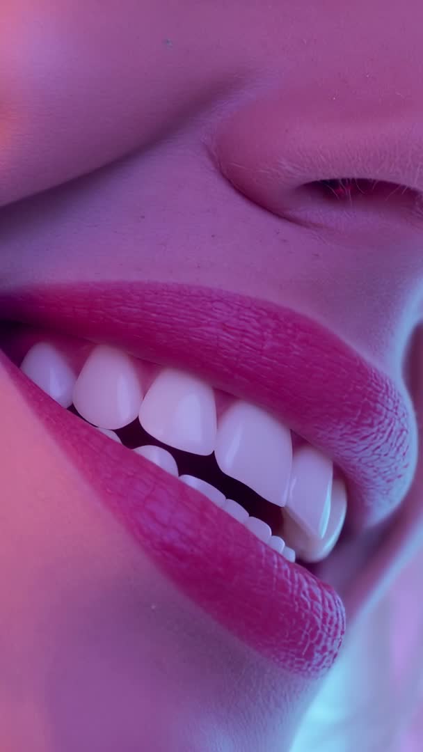 AI Generated Image. Vertical beauty clip capturing close-up of glossy lips and bright white teeth while model smiling and slightly parting lips. Studio neon lighting casting pink and purple hues, creating modern glamour mood. Perfect for promoting lipstick brands, makeup launches, beauty tutorials, social reels, fashion campaigns, sensual editorial content. Working well for cosmetic ads, dental whitening promotions, mobile-first marketing, Instagram Stories. Visuals emphasizing texture of lipstick, tooth brightness, lip shape, sensual expression. Recommended usage including product demo overlays, before-and-after sequences, promotional still extraction, short-form beauty content.