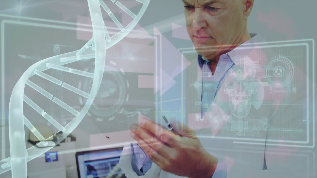 Dentist Analyzing Medical Data with Futuristic Technology Overlay Video