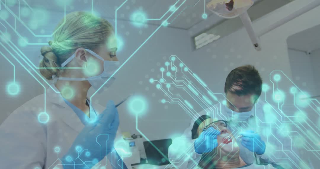 Professionals engage in precise dental care with digital enhancements. Circuit overlay suggests intersection of cutting-edge technology and healthcare services. Ideal for use in health tech promotions, dental innovations, and educational materials showcasing modern medical practices.