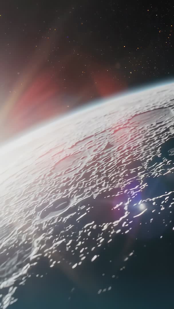AI Generated Image. Descending cinematic vertical video showing descending camera revealing cratered lunar surface above limb while sun producing colored lens flares. Featuring close-up regolith and impact craters passing under camera while terminator line separating light and shadow. Serving space documentary openers, sci-fi trailers, educational explainers on lunar geology, background for title screens, visual effect plates for compositing. Providing slow motion and speed ramp options, crop-safe composition for mobile vertical outlets, loop-friendly clip for social media reels. Color grading suggestions include boosting contrast, adding warm rim light, preserving starfield. Delivery details: 30s vertical clip, 4K vertical, silent playback ready.