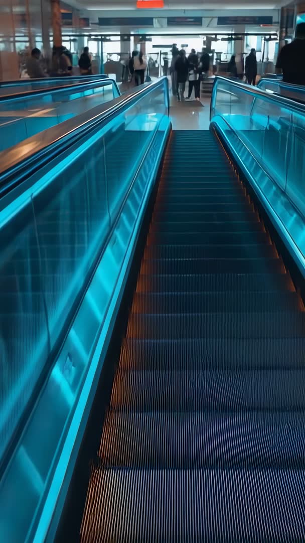 AI Generated Video. Video showing descending escalator with glowing blue LED handrails leading into busy transit foyer. Camera capturing smooth downward motion, textured metal steps, reflective glass balustrades, ambient cool lighting, and silhouetted commuters moving toward concourse. Vertical format suiting mobile-first content, social stories, and vertical ad campaigns. Footage serving well for travel and transit promotions, airport or mall branding, commuter safety messaging, background for title overlays, motion graphics, and dynamic transitions in corporate videos. Editors benefiting from steady movement and distinct blue lighting for color grading, mood edits, or VFX integration. Recommended usage including opener for urban mobility segments, B-roll for transportation reports, background for app demos and social ads, or stock clip for design-driven commercial projects.